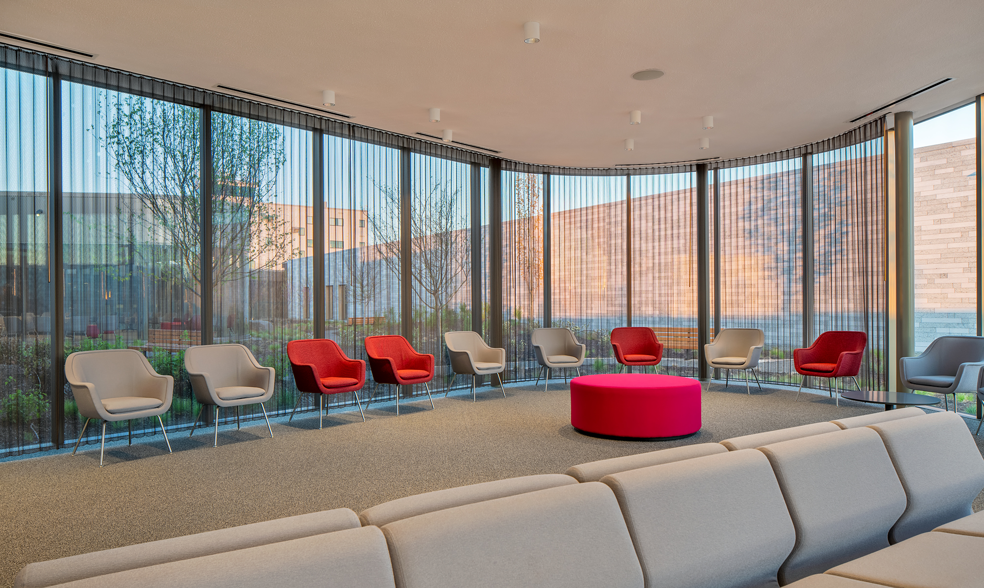The Fabricoil window treatment extends past the floor-to-ceiling glass windows of the lounge to double as a partition separating the open space and public charging stations. This coiled wire fabric divider gives users privacy while working on personal laptops or mobile devices.